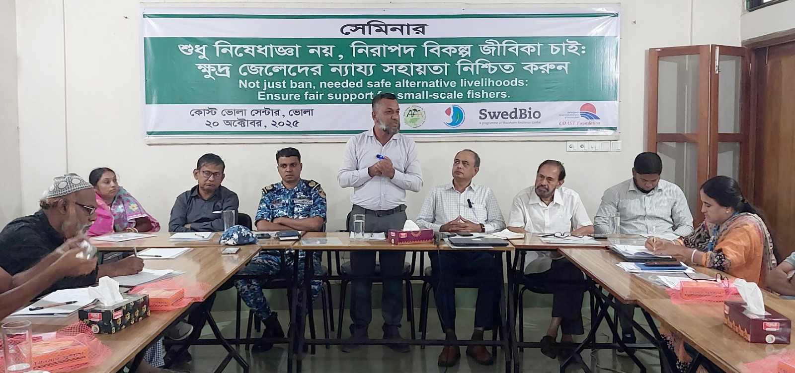 খবর বিজ্ঞপ্তি ॥ কোস্ট ফাউন্ডেশন ২০ অক্টোবর ২০২৫, রোজ সোমবার, কোস্ট ভোলা সেন্টার, ভোলা সদর, ভোলায় “শুধু খ-কালীন সহায়তা-নির্ভর সমাধান নয়, চাই বিকল্প ও টেকসই আয়ের সুযোগ এবং প্রশিক্ষণ” শীর্ষক এক সেমিনারের অনুষ্ঠিত হয়েছে। সনত কুমার ভৌমিক, উপ-নির্বাহী পরিচালক, কোস্ট ফাউন্ডেশন এর সঞ্চালনায় সেমিনারে সভাপত্বি করেন মোবাশ্বির উল্লাহ চৌধুরী কোস্ট ফাউন্ডেশনের সম্মানিত সাধারণ পরিষদের সদস্য, এবং প্রধান অতিথি হিসেবে উপস্থিত ছিলেন মোঃ ইকবাল হোসেন, জেলা মৎস্য কর্মকর্তা, ভোলা। এছাড়াও ভোলা প্রেস ক্লাব, কোস্টগার্ড, পুলিশ প্রশাসন, ধনিয়া ইউনিয়ন পরিষদের প্যানেল চেয়াম্যান, সাংবাদিক ও জেলে নেতৃবৃন্দ অংশগ্রহণ করেন।