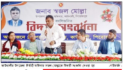 কাউখালী প্রতিবেদক ॥ কাউখালীর উপজেলা নির্বাহী অফিসার সজল মোল্লাকে বিদায়ী সংবর্ধনা দেওয়া হয়েছে। বুধবার দুপুর ১২টায় উপজেলা প্রশাসনের আয়োজনে উপজেলা হলরুমে আয়োজিত অনুষ্ঠানে সভাপতিত্ব করেন সহকারী কমিশনার (ভূমি) সুদীপ্ত দেবনাথ। বক্তব্য রাখেন, উপজেলা কৃষি অফিসার সোমা রাণী দাস, উপজেলা বিএনপির সাধারণ সম্পাদক এইচএম দ্বীন মোহাম্মদ, উপজেলা জামায়াতের সেক্রেটারি অধ্যাপক হুমায়ুন কবির, উপজেলা ইসলামী আন্দোলনের সভাপতি আলী হোসেন, বীর মুক্তিযোদ্ধা মাস্টার শাহ আলম, কাউখালী সদর ইউনিয়ন পরিষদের চেয়ারম্যান মোস্তাফিজুর রহমান, এসবি সরকারি বালিকা উচ্চ বিদ্যালয়ের প্রধান শিক্ষক রফিকুল ইসলাম, আরএসডিএম দাখিল মাদ্রাসার সুপার মাওলানা দেলোয়ার হোসেন, সাংবাদিক রিয়াদ মাহমুদ সিকদার, এনামুল হক, রফিকুল ইসলাম প্রমুখ। অনুষ্ঠান সঞ্চালনা করেন উপজেলা মাধ্যমিক শিক্ষা অফিসার আব্দুল হান্নান।